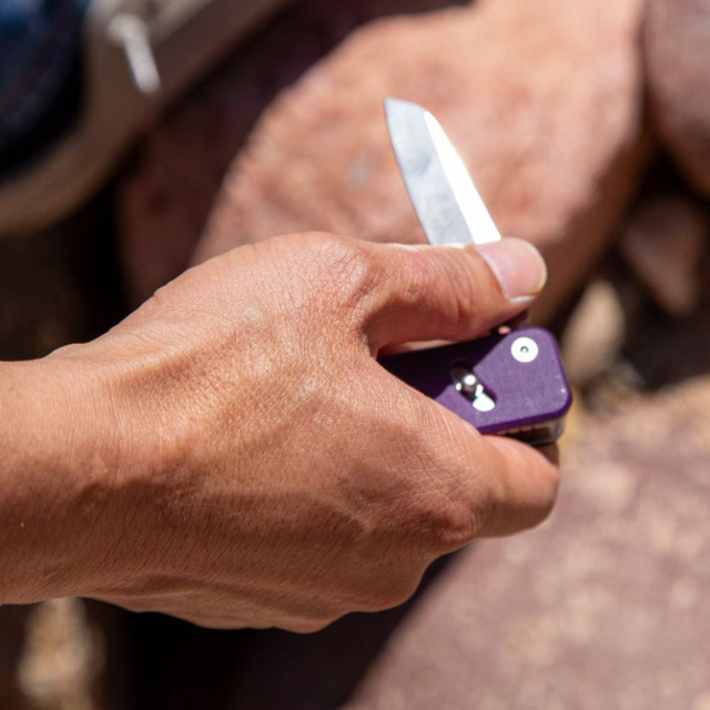 На руківʼї закріплено шорсткі плашки G10 для чіпкого хвата, а бічна кліпса полегшує носіння на кишені.