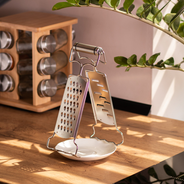 Эта стильная и функциональная универсальная терка для овощей и фруктов станет незаменимым помощником в повседневной готовке. Компактная, прочная и продуманная до мелочей, она отлично справляется как с грубой тёркой овощей, так и с аккуратной нарезкой ломтиками. Две рабочие поверхности с разными типами лезвий позволяют быстро и удобно натирать сыр, морковь, картофель, кабачки, огурцы, шоколад и многое другое. Вся конструкция — от ручки до корпуса — выполнена из нержавеющей стали. Это не только делает тёрку долговечной и устойчивой к коррозии, но и придаёт ей элегантный внешний вид, который украсит любую кухню. Умная деталь — изогнутое и текстурированное основание. Оно позволяет легко зафиксировать тёрку на краю тарелки или миски, чтобы вы могли натирать продукты прямо в посуду, не боясь, что тёрка соскользнёт. Несмотря на отсутствие силиконовой подложки, конструкция обеспечивает отличную устойчивость. А эргономичная металлическая ручка обеспечивает уверенный и комфортный хват даже при длительной работе. Основные характеристики ручной терки из нержавейки: Материал терки: нержавеющая сталь; Материал ручки: нержавеющая сталь; Размер: 9×4×24 см; Количество рабочих сторон: 2; Ширина рабочей поверхности: 4.5 см; Длина рабочей поверхности: 10.5 см; Противоскользящее основание: нет. Особенности металлической терки для овощей: Двусторонняя рабочая поверхность — одна сторона для грубого натирания, другая для нарезки ломтиками Универсальность — подходит для сыра, овощей, фруктов, шоколада и других продуктов Полностью из нержавеющей стали — устойчива к коррозии, не впитывает запахи, легко моется Удобная металлическая ручка — обеспечивает комфортный хват даже при интенсивной работе Изогнутое текстурированное дно — фиксируется на краю миски или тарелки для устойчивости Компактность и лёгкий вес (200 г) — удобно хранить и использовать каждый день Стильный минималистичный дизайн — отлично впишется в любую кухню Эта двусторонняя тёрка — идеальный выбор для тех, кто ценит удобство, надёжность и аккуратный внешний вид кухонных инструментов. Прочная конструкция из нержавеющей стали, продуманный дизайн и универсальность делают её отличным помощником в ежедневной готовке. Компактная, лёгкая и практичная — она сэкономит ваше время и обеспечит идеальный результат при нарезке и натирании продуктов.