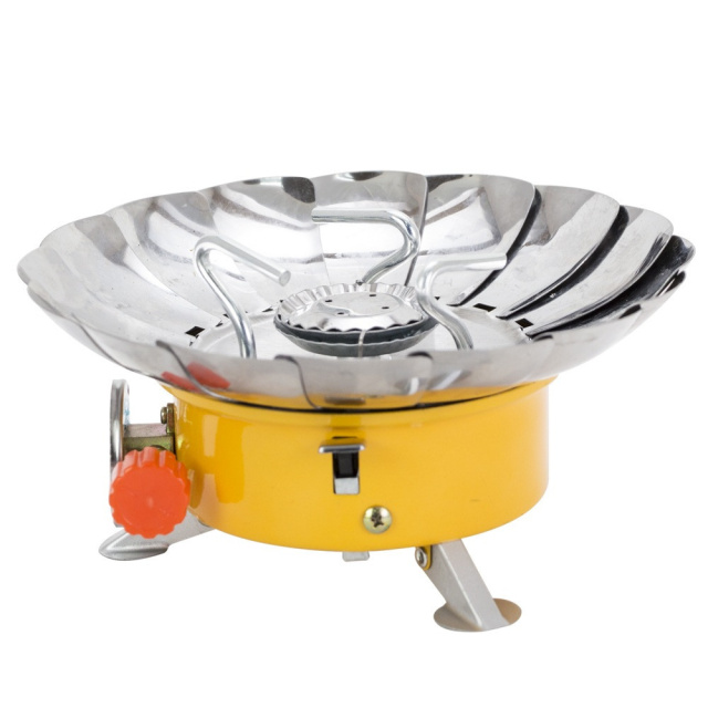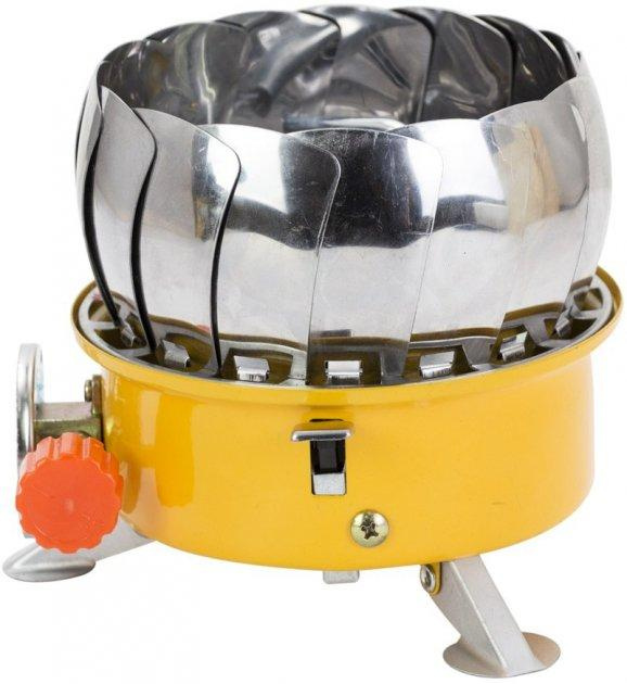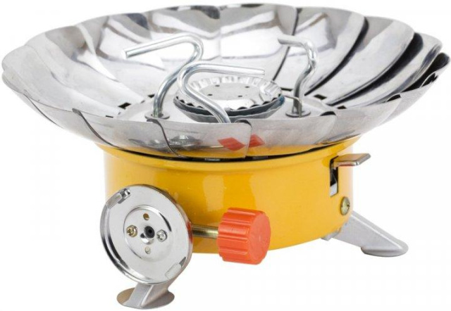 Працює від одноразових балонів з цанговим затискачем. Тримачі посуду зручно регулюються під різний розмір дна посуду. Особливою перевагою є наявність складних пелюсток, які захистять плиту від загасання в вітряну погоду. А п'єзоелемент допоможе швидко розпалити вогонь.