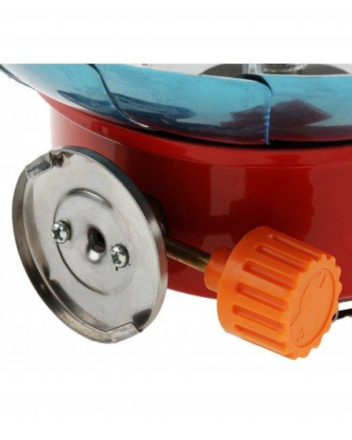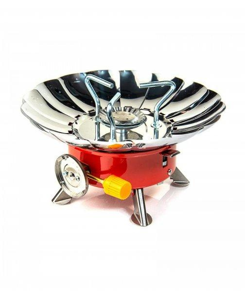 Працює від одноразових балонів з цанговим затискачем. Тримачі посуду зручно регулюються під різний розмір дна посуду. Особливою перевагою є наявність складних пелюсток, які захистять плиту від загасання в вітряну погоду. А п'єзоелемент допоможе швидко розпалити вогонь.