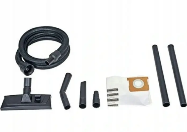 - Поставляється зі шлангом довжиною 2,4 м, патронним фільтром (для сухого збирання), рукавом з губчастого фільтра (для збирання рідин), мішком для збору пилу (для сухого збирання), подвійною насадкою для підлоги (щітка і швабра), щілинною насадкою та 3 пластиковими трубками.