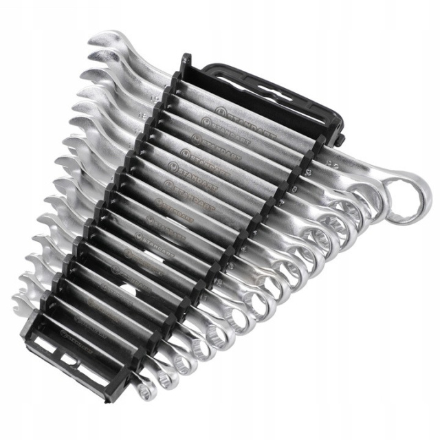 Набор рожково-накидных ключей STANDART включает 15 ключей размером от 6 до 19, 22 мм, обеспечивая полную комплектацию, необходимую для большинства монтажных и ремонтных работ. Ключи размещены в практичном пластиковом держателе, что облегчает организацию и быстрый доступ к инструментам. Благодаря метрической системе измерения набор идеально подходит для использования в различных условиях работы. Каждый ключ имеет прямую форму и комбинированный тип, что делает его универсальным и полезным в любой мастерской, гараже или домашнем наборе инструментов.
