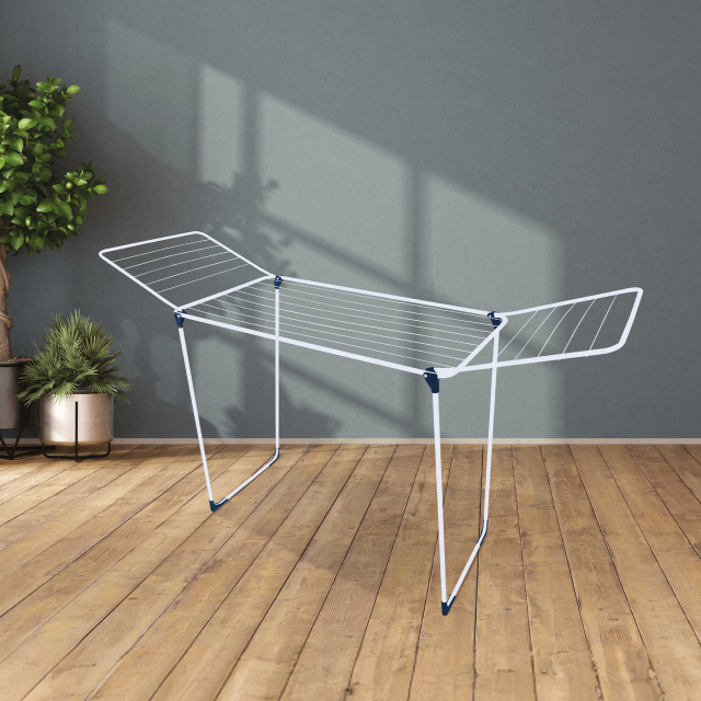 Сушилка для белья Casa Si Merkur Pluse имеет рабочую поверхность 18 метров, чего хватает для сушки белья после двух циклов стирки стандартной пятикилограммовой стиральной машинки. Это одна из самых легких стальных напольных сушилок с такой длиной рабочей поверхности. Пластиковые ножки предотвращают порчу пола.