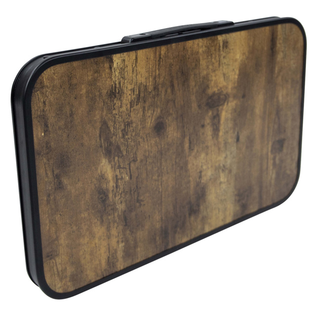 Столешница из МДФ с декоративной отделкой под дерево добавляет эстетики и индустриального шарма. Каркас из алюминия обеспечивает легкость конструкции и выдерживает нагрузку до 25 кг. Складные ножки позволяют быстро разложить или собрать стол, а ручка на боку облегчает транспортировку. В сложенном виде стол имеет толщину всего 3.5 см - его удобно хранить или брать с собой в путешествие.