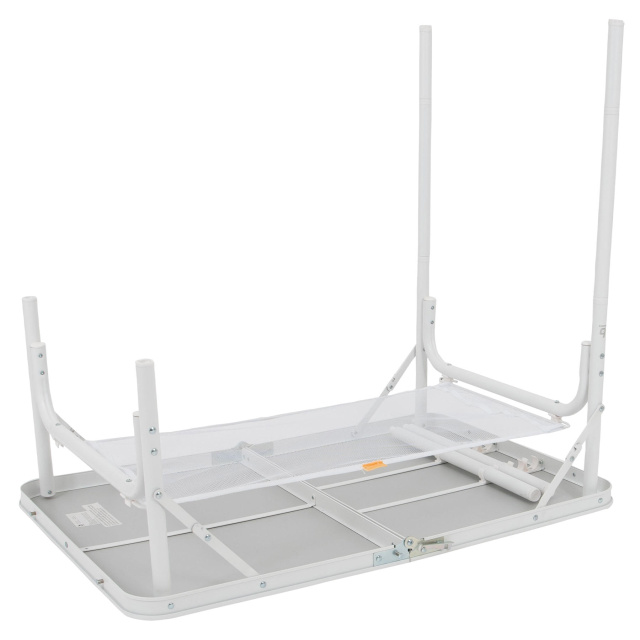 Ножки с точной винтовой регулировкой легко выставляются даже на неровной поверхности. Стол имеет складную столешницу и съемные ножки, благодаря чему компактно складывается в форму чемоданчика (всего 60x45x7 см). Под столешницей предусмотрено сетчатую полку для хранения вещей, а удобная ручка позволяет легко переносить стол.