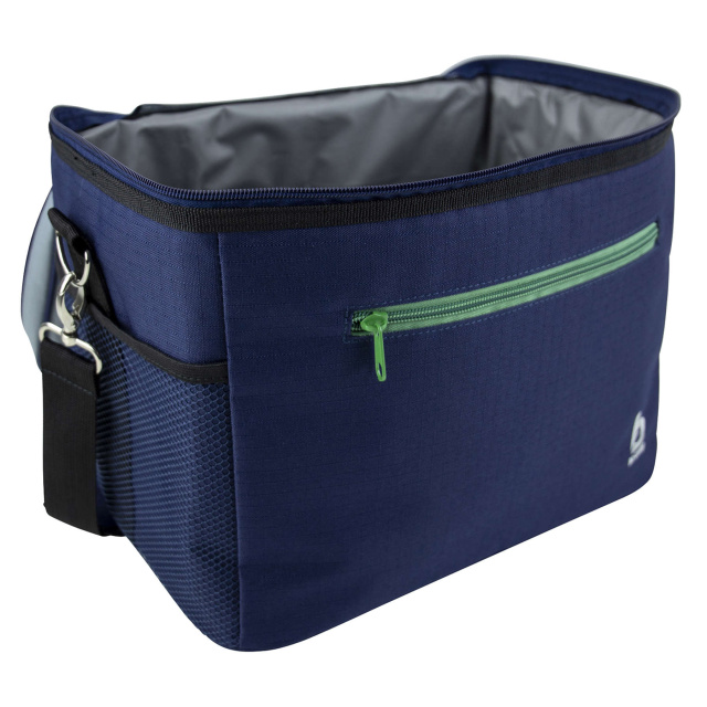 Внутреннее покрытие изготовлено из водонепроницаемого ПВХ-материала, которое не впитывает запахов, легко моется и дополнительно сохраняет температуру благодаря серебристому цвету. Сумка имеет удобный плечевой ремень, передний карман на молнии и два боковых сетчатых кармана для мелочей или бутылок. Благодаря прочному полиэстеру внешняя часть сумки устойчива к износу, загрязнениям и легко чистится.