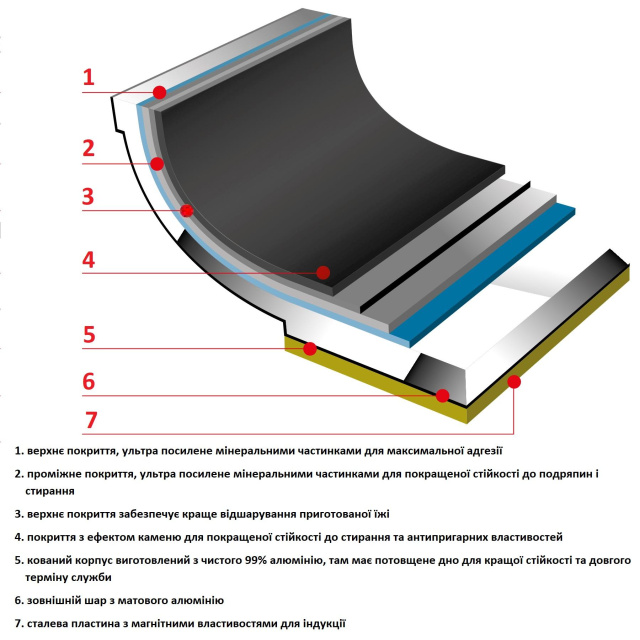 MAGMA-TECH PLUS COATING - на 35% устойчивее к царапинам чем предыдущие покрытия, новое покрытие Magma-Tech Plus на водной основе, усиленное микроминеральными частицами различной формы и величины, разработанное для максимальной износостойкости, стабильной и эффективной работы в течение продолжительного времени. Это четырехслойное экологически чистое покрытие наносится более толстыми слоями методом напыления, не содержит вредных соединений перфтороктановой кислоты (PFOA), никеля и других тяжелых металлов. Покрытие достаточно устойчиво, в том числе, и к использованию металлических столовых приборов и аксессуаров для приготовления пищи. Для приготовления пищи в посуде с антипригарным покрытием Magma-Tech Plus нет необходимости добавлять масло, так что пища после приготовления остается здоровой и полезной.