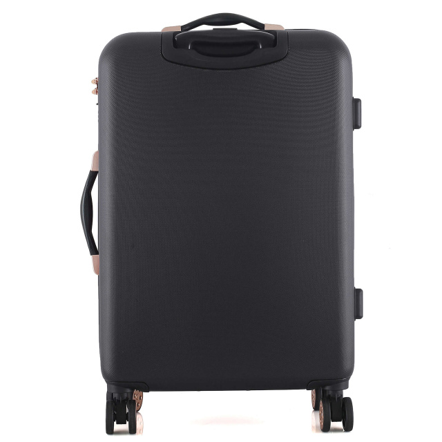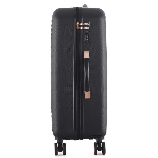 Черный чемодан Semi Line T5718 с многочисленными металлическими и пластиковыми вставками под золото и волнистым узором фасада выглядит достаточно изысканно. Он оснащен легкой алюминиевой телескопической ручкой, которая фиксируется в трех положениях, а ручки для переноски чемодана в руках выполнены из приятного на ощупь пластика Soft-Touch. "Утопленный" кодовый замок призван защитить содержимое вашего чемодана, а также не выступает над корпусом, так что его невозможно случайно повредить при транспортировке чемодана