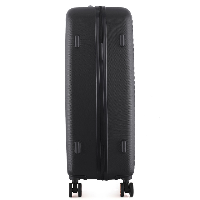 Черный чемодан Semi Line T5718 с многочисленными металлическими и пластиковыми вставками под золото и волнистым узором фасада выглядит достаточно изысканно. Он оснащен легкой алюминиевой телескопической ручкой, которая фиксируется в трех положениях, а ручки для переноски чемодана в руках выполнены из приятного на ощупь пластика Soft-Touch. "Утопленный" кодовый замок призван защитить содержимое вашего чемодана, а также не выступает над корпусом, так что его невозможно случайно повредить при транспортировке чемодана