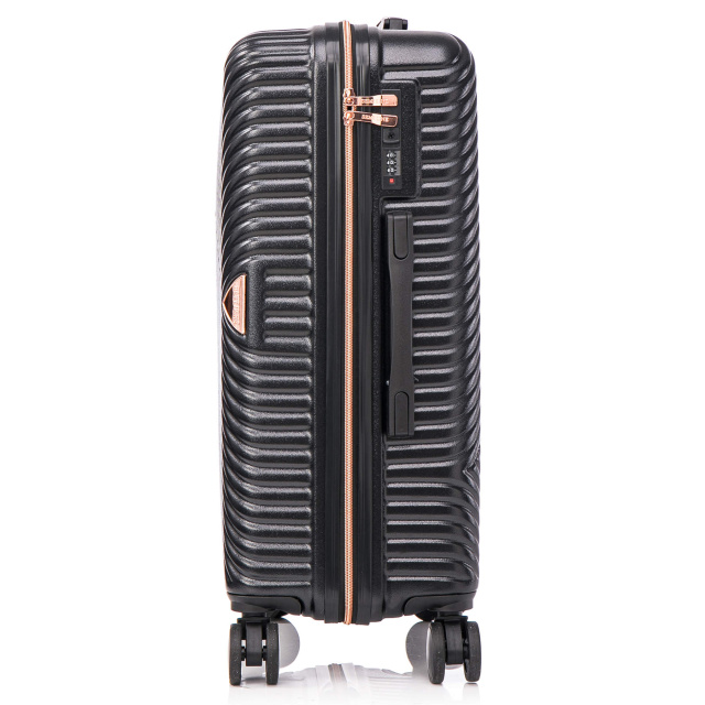 Чемодан оснащен легкой алюминиевой телескопической ручкой, которая фиксируется в трех положениях. "Утопленный" кодовый замок призван защитить содержимое вашего чемодана, а также не выступает над корпусом, так что его невозможно случайно повредить при транспортировке чемодана.