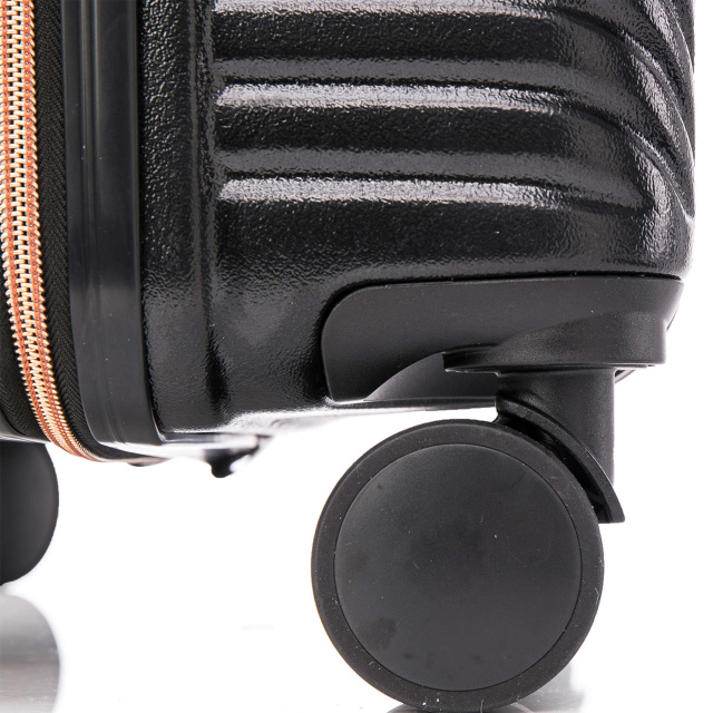 - Полноповоротные колеса - данная модель оснащена четырьмя спаренными колесами большого диаметра, вращающимися на 360°. Спаренные колеса обеспечивают лучшее распределение веса и устойчивость чемодана, отличное сцепление, маневренность и большую износостойкость. Колеса крепятся на 4 винта изнутри, что обеспечивает высокую стойкость при ударной нагрузке с любой стороны, и позволяет их заменить при износе.