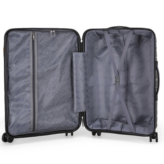 - Чемодан имеет текстильную перегородку на молнии, которая разделяет внутреннее пространство на два основных отделения, и оснащена карманом для мелких вещей.