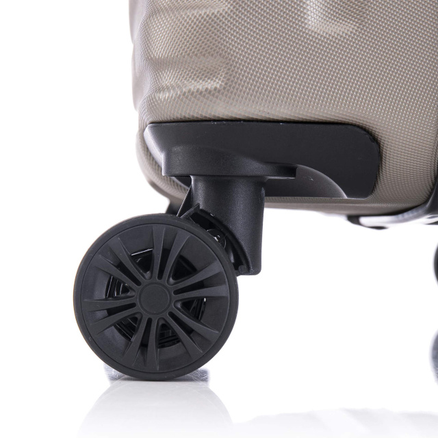 - Полноповоротные колеса - данная модель оснащена четырьмя спаренными колесами, вращающимися на 360°. Спаренные колеса обеспечивают лучшее распределение веса и устойчивость чемодана, отличное сцепление, маневренность и большую износостойкость. Колеса крепятся на 5 винтов изнутри, что обеспечивает максимальную стойкость при ударной нагрузке с любой стороны, и позволяет их заменить при износе.