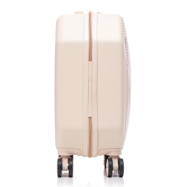 Интересным и более удобным решением является размещение кодового замка сверху, а абсолютно вся фурнитура выполнена в одном цвете с корпусом чемодана.