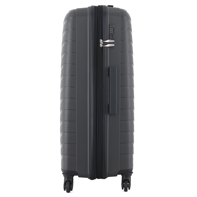 Чемодан оснащен легкой алюминиевой телескопической ручкой, которая фиксируется аж в четырех положениях по высоте. "Утопленный" кодовый замок призван защитить содержимое вашего чемодана, а также не выступает над корпусом, так что его невозможно случайно повредить при транспортировке чемодана. Корпус выглядит как глянцевый, однако большая его часть имеет мелкий узор, скрывающий микроцарапины в процессе эксплуатации.