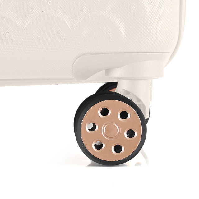 - Полноповоротные колеса - данная модель оснащена четырьмя спаренными колесами, вращающимися на 360°. Спаренные колеса обеспечивают лучшее распределение веса и устойчивость чемодана, отличное сцепление, маневренность и большую износостойкость. Колеса крепятся на 4 винта изнутри, что обеспечивает высокую стойкость при ударной нагрузке с любой стороны, и позволяет их заменить при износе.