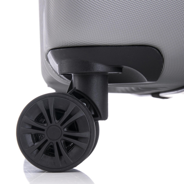 - Полноповоротные колеса - данная модель оснащена четырьмя спаренными колесами, вращающимися на 360°. Спаренные колеса обеспечивают лучшее распределение веса и устойчивость чемодана, отличное сцепление, маневренность и большую износостойкость. Колеса крепятся на 5 винтов изнутри, что обеспечивает максимальную стойкость при ударной нагрузке с любой стороны, и позволяет их заменить при износе.