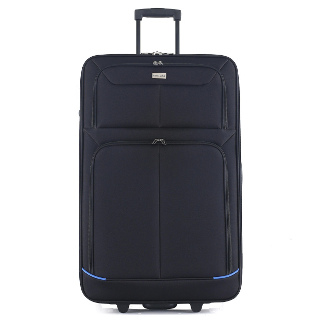 Две синие полосы на фасаде делают вид чемодана более выразительным, а главное позволят быстрее найти именно ваш чемодан в багажных отделениях среди многих других похожих чемоданов. Два глубоких кармана на фасаде способны вместить большое количество вещей первой необходимости. Для размещения мелких вещей внутри чемодана предусмотрен отдельный карман на молнии. Телескопическая стальная ручка фиксируется в двух положениях.