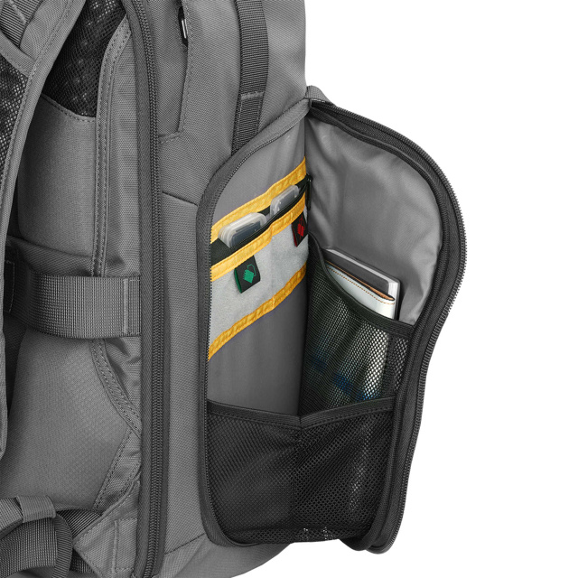 - Боковые карманы на эластичной стяжке и ремешок на верхней петле позволяют зафиксировать небольшой полноразмерный штатив с каждой стороны рюкзака;