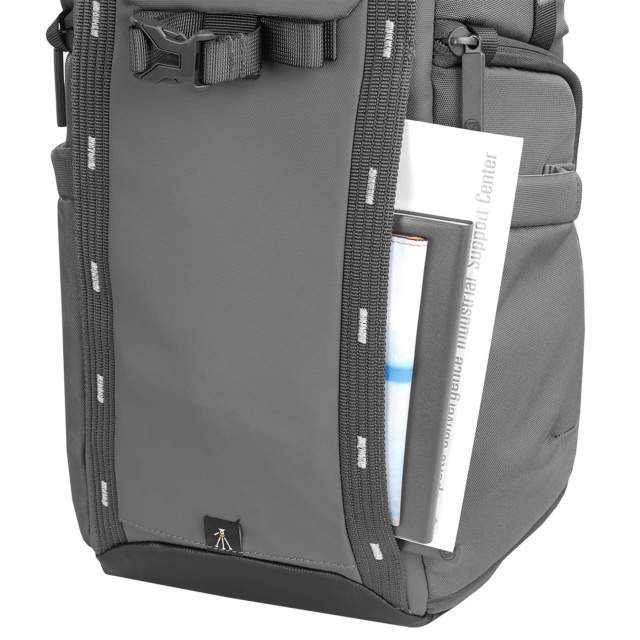 - Специальная текстильная пятка на стяжке, скрытая в фасадном кармашке, позволяет с помощью ремешка и верхней петли снаружи закрепить на фасаде небольшой полноразмерный штатив;