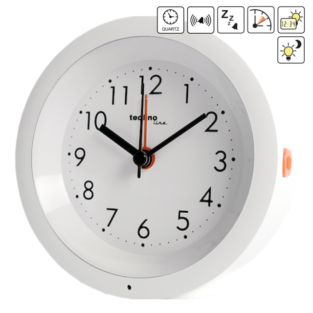 Яркая белая LED-подсветка всего циферблата, функция автоматической ночной подсветки, абсолютно бесшумный механизм с плавным движением секундной стрелки, будильник с функцией отложенного сигнала Snooze - все это делает Technoline Modell X одними из лучших настольных стрелочных часов. Резиновая накладка на основе корпуса обеспечивает лучшую стойкость на лакированных поверхностях и стеклах.