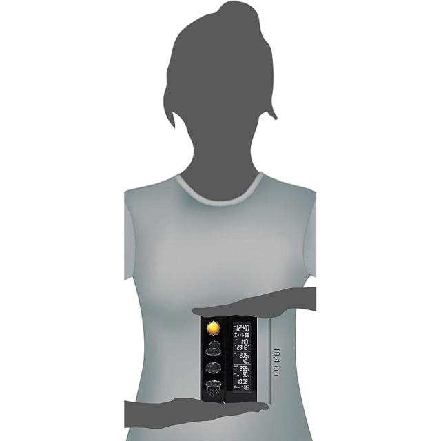 Метеостанция оснащена беспроводным датчиком, который позволяет измерять внешнюю температуру и влажность. Дополнительно можно подключить 2 датчика, которые позволят получать данные из разных помещений, таких как детская, спальня или гараж. Синхронизация времени с радиосигналом DCF77 позволяет всегда быть уверенным в точности часов, а будильник с функцией отложенного срабатывания сигнала (snooze) дает возможность настроить оповещения о важных событиях или вовремя проснуться утром. Работает метеостанция от блока питания, а в случае сбоев в сети, предусмотрена работа от 4-х батареек размера AAA.