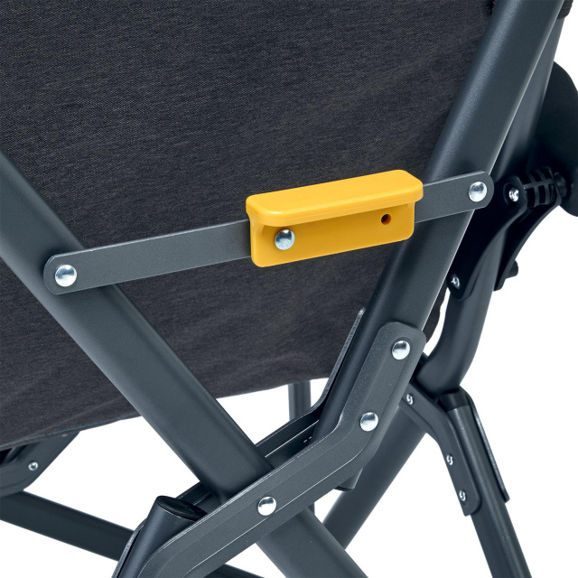 Разборная конструкция спинки позволила сделать высокое кресло не столь громоздким в собранном виде, как большинство моделей на рынке. Небольшой текстильный подстаканник позволяет разместить в нем бутылку или стакан. Специальный фиксатор кресла в разложенном состоянии гарантирует, что кресло не сложится случайным образом.
