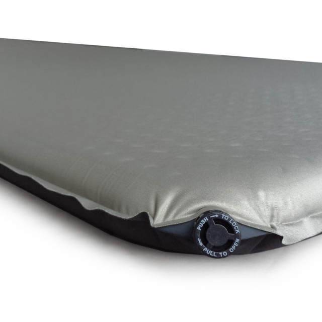 - Большой двусторонний клапан с фиксатором позволяет быстро надувать и сдувать коврик.