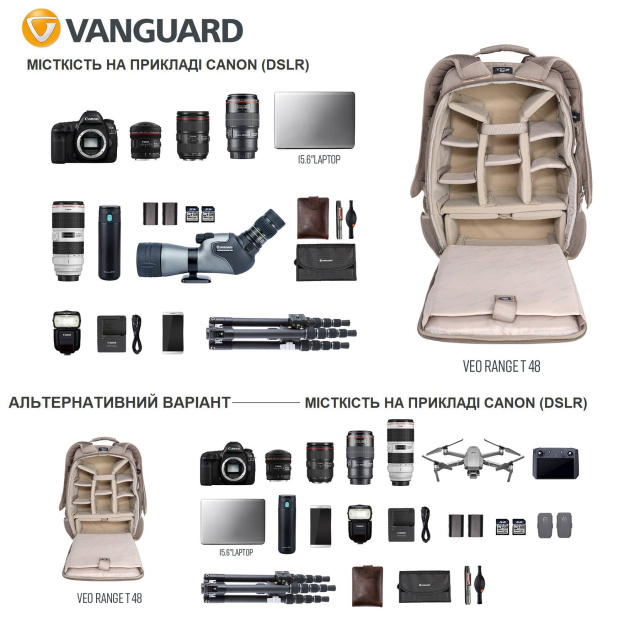 Компания Vanguard едва ли не единственная, кто производит тактические рюкзаки для фотографов и операторов дронов. Имея внешний вид тактического рюкзака, Vanguard VEO Range T 48 создан, чтобы предоставить максимальную защиту и зафиксировать размещенное в нем фотооборудование, а также обеспечить быстрый доступ к фотокамере. Рюкзак имеет широкую комплектацию, включающую в себя накидку от дождя, держатель для фляги и систему крепления штатива. Благодаря модульной