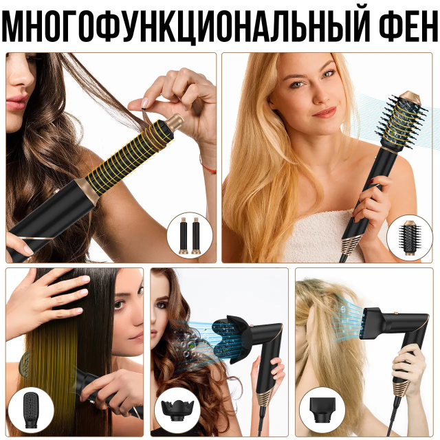 - 6 насадок для різних завдань: Легко перемикайтеся між сушінням, випрямленням, завивкою, створенням об'єму або натуральних хвиль.