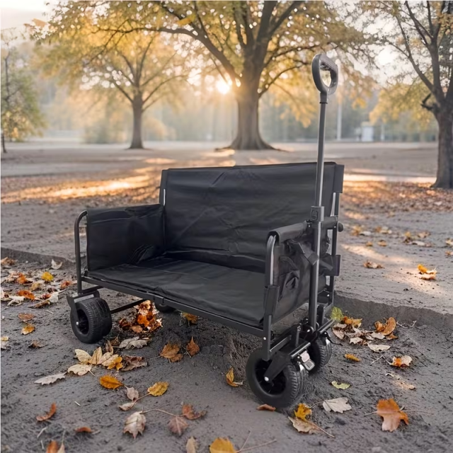 Це універсальний складаний візок-трансформер у класичному чорному кольорі, розроблений для максимального комфорту під час подорожей, риболовлі або роботи в саду. Основна особливість цієї моделі — відкидний борт, що дозволяє перевозити габаритні вантажі або використовувати візок як зручну лаву.
