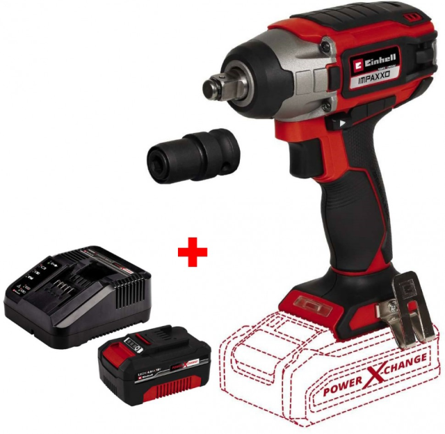 Ударний Безщітковий гайковерт лінійки Power X-Change system Einhell IMPAXXO 18/230 - Solo серії Professional призначений для загвинчування / вигвинчування колісних гайок, а за допомогою адаптера для біт робіт по дереву, металу: для загвинчування / вигвинчування довгих кріпильних елементів як вдома , так і в майстерні або гаражі. Einhell IMPAXXO 18/230 бездротовий ударний гайковерт є високоякісним, ударним інструментом, який дозволяє викручувати навіть щільно посаджені колісні гайки. Він оснащений безщітковим двигуном для кращої продуктивності і продовження часу роботи в порівнянні зі звичайними двигунами з вугільними щітками. У безщіткового ударного гайковерта відсутній будь-який знос від механічного тертя з максимальним затягуючим моментом 230 Нм. Завдяки компактній і легкій конструкції з ергономічним м'яким покриттям поверхні ударний гайковерт дуже добре лежить в руці. Він має спеціальний ударний механізм для усунення будь-яких торсіонних сил на зап'ясті користувача. Таким чином, користувач може легко затягнути будь-які гайки. Він оснащений міцним квадратним кріпленням на 1/2 дюйма, а також є перехідник для біт. Вбудоване Led підсвічування для оптимального освітлення робочої зони. Інструмент поставляється з Power X-Change акумулятором 18V 4,0 Ah і зарядним пристроєм.