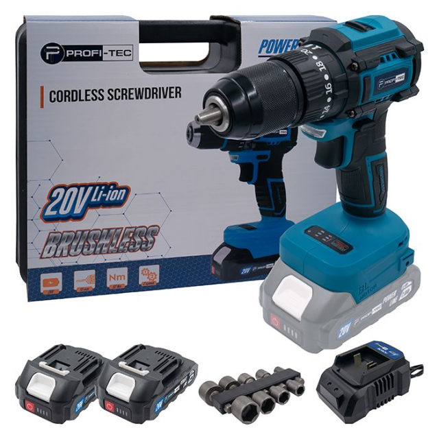 Акумуляторний шуруповерт PROFI-TEC PCD5220BL POWERLine : з АКБ 2шт-20V 2.0 Ah, 52 Нм, набір головок, Одеса