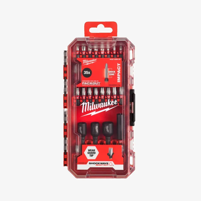 Milwaukee SHOCKWAVE Packout, 35 шт — універсальний набір ударостійких біт, свердел та аксесуарів у кейсі, сумісному з системою PACKOUT™. Оснащений технологією Shock Zone™ для поглинання навантажень. Підходить для професійного використання з ударними шуруповертами.