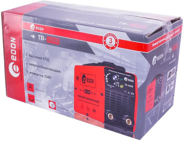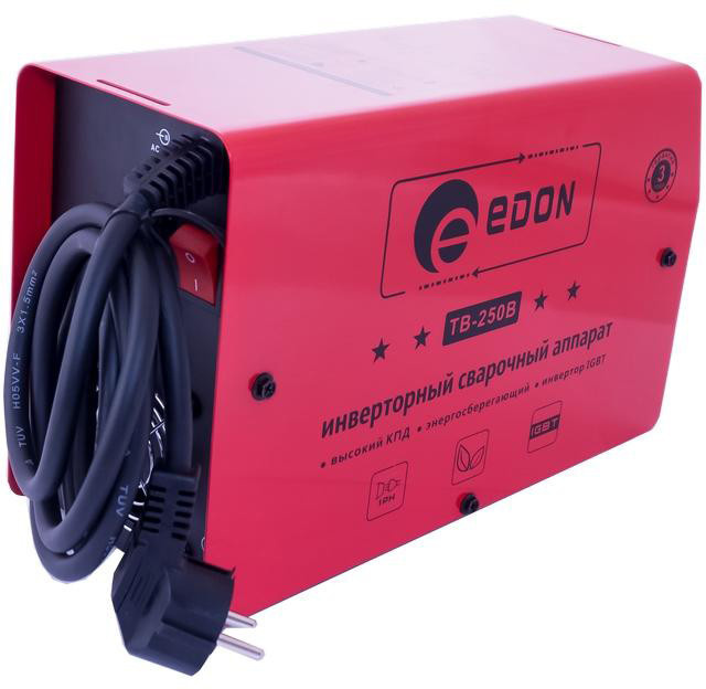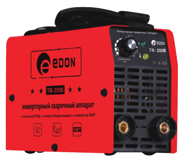 Зварювальний інвертор Edon TB-250B – високопотужний і дуже продуктивний агрегат, який можна використовувати для зварювання, різання і наплавлення металевих листів, виробів і конструкцій з металу. Діаметр використовуваних для роботи з ними зварювальних електродів може бути до 5 і більше міліметрів. Агрегат невибагливий в роботі і обслуговуванні, недорогий по вартості і показує високу якість роботи і зварювальних швів. Освоїти роботу з ним не складно професійному майстру і новачкові зварного справи, домашньому майстрові, який працює з металами, авторемонтнику. Сила струму зварювання у інвертора може бути в межах від 20 до 250 А. Потужність невелика і не перевищує 4,5 кВт. Працювати з агрегатом можна в приміщенні і на вулиці, на висоті. Він може застосовуватися для робіт з металами - на дачі, в заміському будинку, гаражі, на будівельному майданчику, станції технічного обслуговування, на невеликому підприємстві і в авторемонтної майстерні. У набір до нього додаються: сам агрегат і комплектуючі до нього (кабелю маси, захисний зварювальний щиток, кабель з тримачем для електродів, щітка-молоток), інструкція по використанню, гарантійні документи. Клас інвертора побутової, але при цьому показники потужності досить високі, щоб він зміг витримувати високі і тривалі робочі навантаження. Система охолодження у вироби - повітряно-примусова. Є захисту від робочих перевантажень, перегрівання. Підживлюється інвертор від побутової однофазовий мережі на 220 В і частотою - 50 Гц.