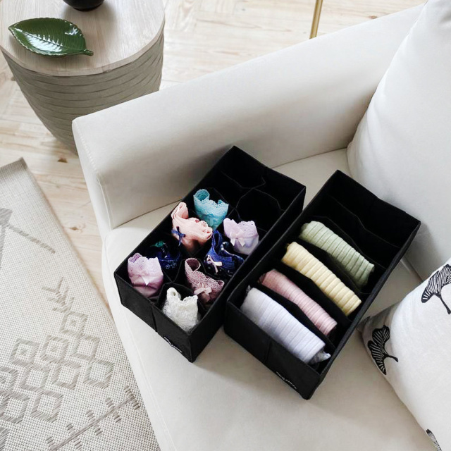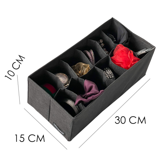 Набор из 2 органайзеров 30×15×10 см — удобное решение для организации мелкого белья и аксессуаров в ящике комода. Один органайзер имеет 12 ячеек, второй — 6 более просторных секций, что позволяет разложить по категориям: трусики, носки, колготки, ремни, косметику или другие мелочи.