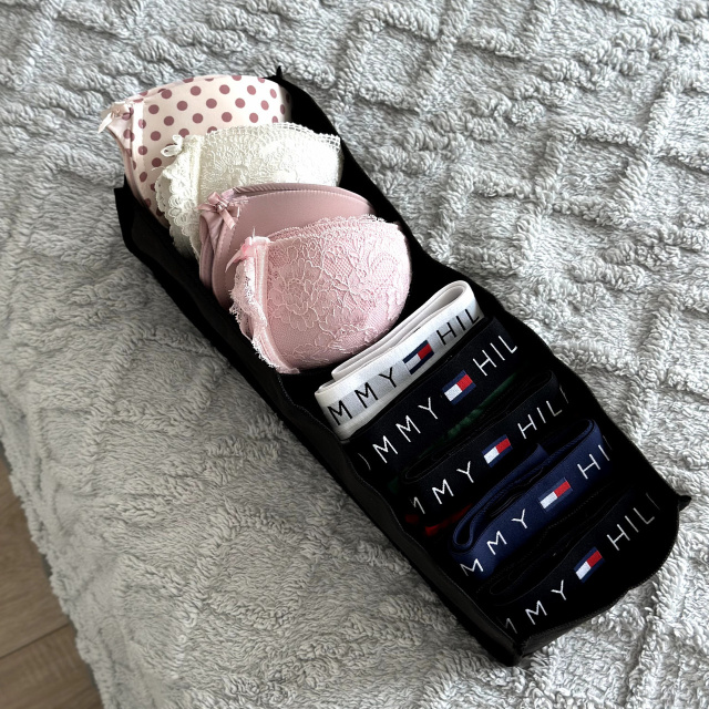 Этот формат удобен для хранения трусиков, носочков, а также детских вещей: бодиков, шапочек и носочков. Благодаря продуманной форме вещи не мнутся, не смешиваются и остаются аккуратно разложенными.