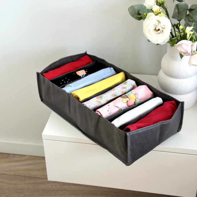 Гибкий текстильный органайзер 20×39×9 см серого цвета — универсальное решение для хранения нижнего белья, детской одежды и мелкого текстиля. Благодаря вытянутой форме он идеально подходит для использования в ящиках детского комода или гардероба, помогая рационально использовать пространство.