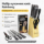 В комплект входит 5 кухонных ножей различного назначения, кухонные ножницы и вертикальная металлическая подставка для хранения. Такое сочетание позволяет работать с разными типами продуктов и одновременно поддерживать порядок на кухонной поверхности.