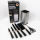 В комплект входит 5 кухонных ножей различного назначения, кухонные ножницы и вертикальная металлическая подставка для хранения. Такое сочетание позволяет работать с разными типами продуктов и одновременно поддерживать порядок на кухонной поверхности.