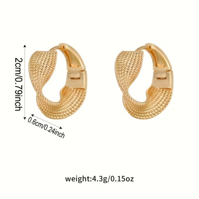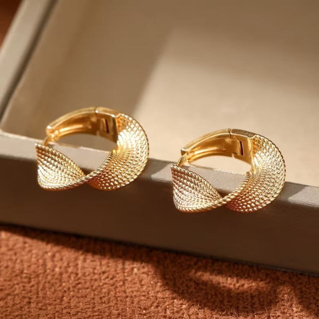 Элегантные женские серьги-кольца в золотистом цвете — стильный аксессуар с выразительной текстурированной поверхностью. Модель выполнена в объемном дизайне с оригинальным рельефным плетением, которое придает украшению эффектный блеск и глубину. Изогнутая форма делает серьги современными и заметными, при этом они остаются универсальными для разных образов.