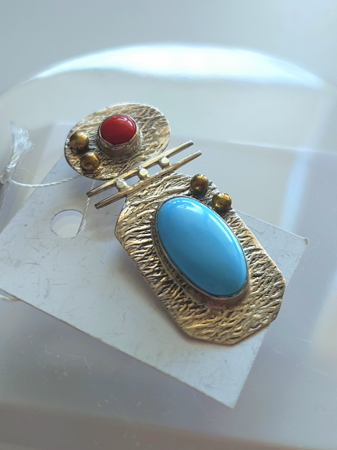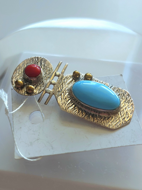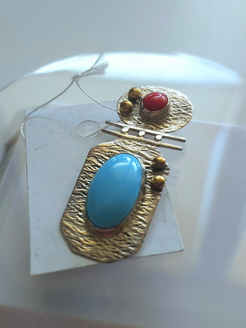Срібний кулон в етнічному стилі з бірюзою, коралом та позолотою, Одеса